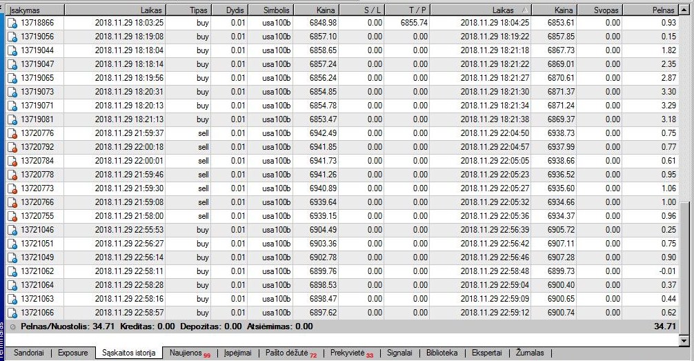 Tonis [2018-11-30 12:34]: Man asmeniškai su 500 eur suma geriausia būtų prekiauti Nasdaq - 100 indekso CFD. Judesių užtenka, komisiniai ir spredai nesuvalgo. Atidumo reikia, bet prekiauti įmanoma ir pakankamai smagu. Pats mėgstu aktyvią scalpingo prekybą - tad prekiauju su malonumu. Čia pateikiu vakar dienos paskutinę prekybą vakare. Pagrinde bandau nuolat gaudyti 1-5 $ pelną kiekvienoje situacijoje. Per dieną susirenka visai geras pelno procentas, jei visą dieną atidžiai atidirbu prekyboje. ![]() smagu, bet nera augimo... |