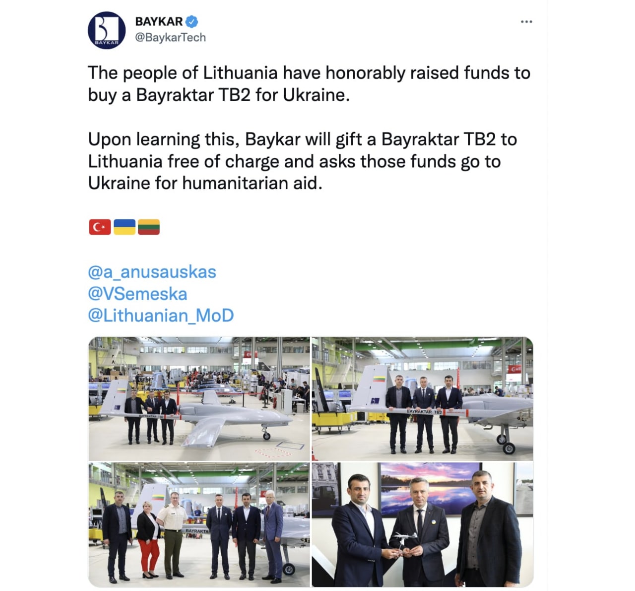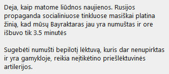 boomas [2022-06-02 15:08]: Vo kaip gavos su bairaktaru... Su Bayraktar gavosi visai kitaip, praeitos savaites zinios: "Deja, kaip matome liūdnos naujienos. Rusijos propaganda socialiniuose tinkluose masiškai platina žinią, kad mūsų Bayraktaras jau yra numuštas ir ore išbuvo tik 3.5 minutės" "Baidenas neduoda, Baidenas sabotuoja."