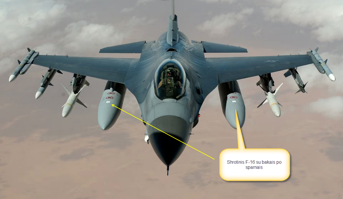 Stai shrotinis F-16 su bakais po sparnais, kur jie uzima pacia naudingiausia vieta.