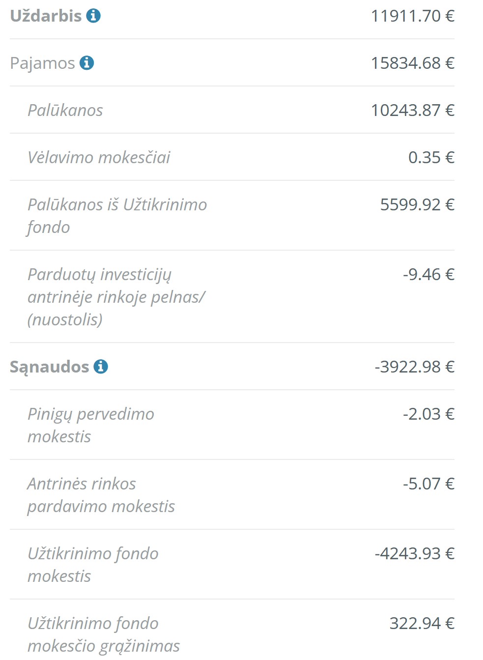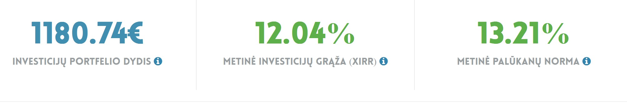 6.68% Metinė investicijų grąža (XIRR) 12.56% Metinė palūkanų norma T.y. kodėl visų toks didelis XIRR? Jis priartės prie metinių palūkanų tik po keleto metų? Kaip matosi pagal palūkanų normą - investuoju saugiai. |