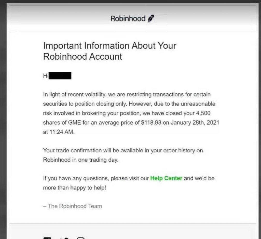 Robinhood'as jau gali eit langus ofiso užkalt, nes neįsivaizduoju kokie klientai toliau dirbs su brokeriu, kuris vienašališkai paima ir uždaro orderius net jeigu tokia galimybė kontrakte yra palikta. Čia jau patys kalti, kad nesugebėjo laiku rizikų susitvarkyti