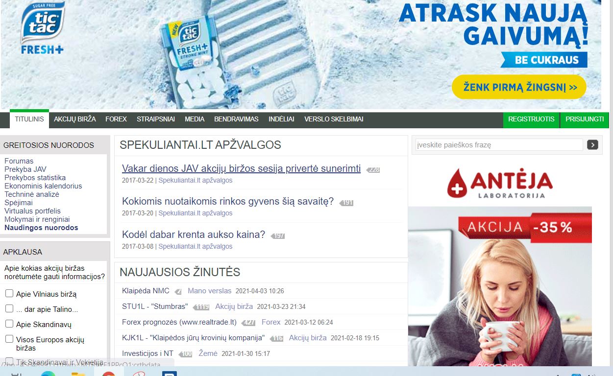 Krosneles.eu [2021-04-05 16:24]: Prie ko čia skriagos, ne skriagos? Asmeniškai VZ nematau nieko įdomaus , ką verta skaityti būtų. Vietiniai pletkai. O delfi mokamas turinys, tai aplamai žemiau visko. ------------------------------------- Traders.lt žymiai idomiau, nes jis yra gyvas. Tai jo privalumas. Krosniau, tau gal nieko idomU, kitiems gal VZ idomu. pradzia butu, o ten su laiku, gal ir priejimas prie rimtos analitikos atsiras... Only skydivers know why the birds sing, only the birds know why skydivers are always smiling.
