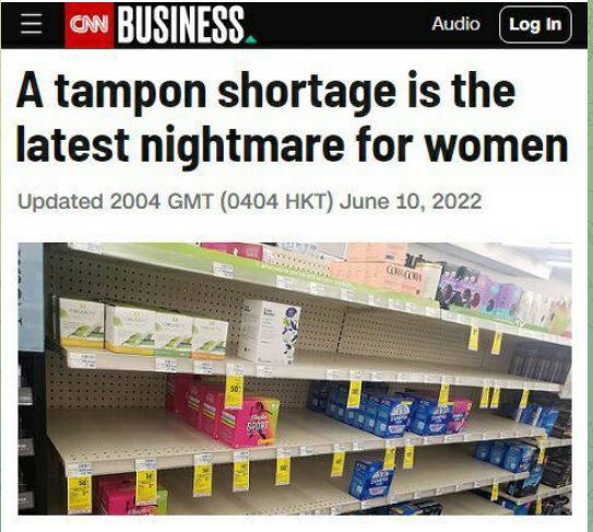 CNN jau rašo, kad net moteriški tamponai jau deficitas Amerikoje. Manau tai nėra normalu. Nežinau, kodėl tamponų trūkumas Amerikoje, bet logiškai galvojant, tai Putinas tikriausiai kaltas. |