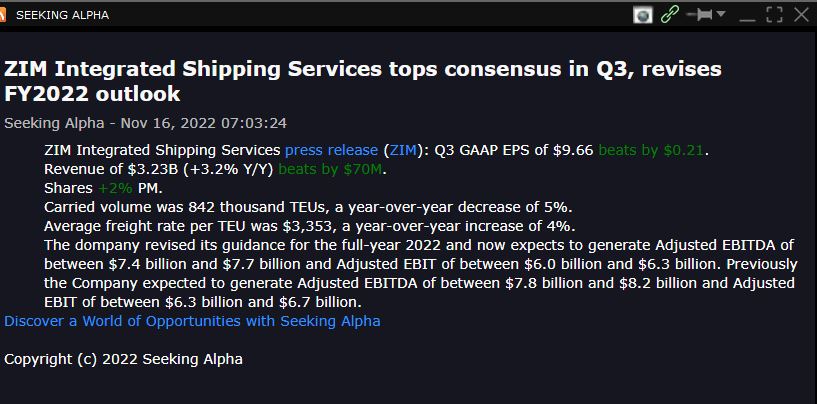 FY2022 outlook adjusted to EBITDA between $7.4 to $7.7 billions... ZIM declares Q3 dividends of $2.95 /share, 30% of Q3 income Lygainam su Mcap, kraipom galvas, raitojamės rankoves P.S. + Q3 prezentacija, man tik 12 skaidrė nepatinka, bet kaip čia pasakius, ne naujiena tai https://s27.q4cdn.com/416879924/files/doc_financials/2022/q3/Q3-2022-Investor-Presentation-Final-16-11-2022.pdf "Price is what you pay. Value is what you get." ― Warren Buffett