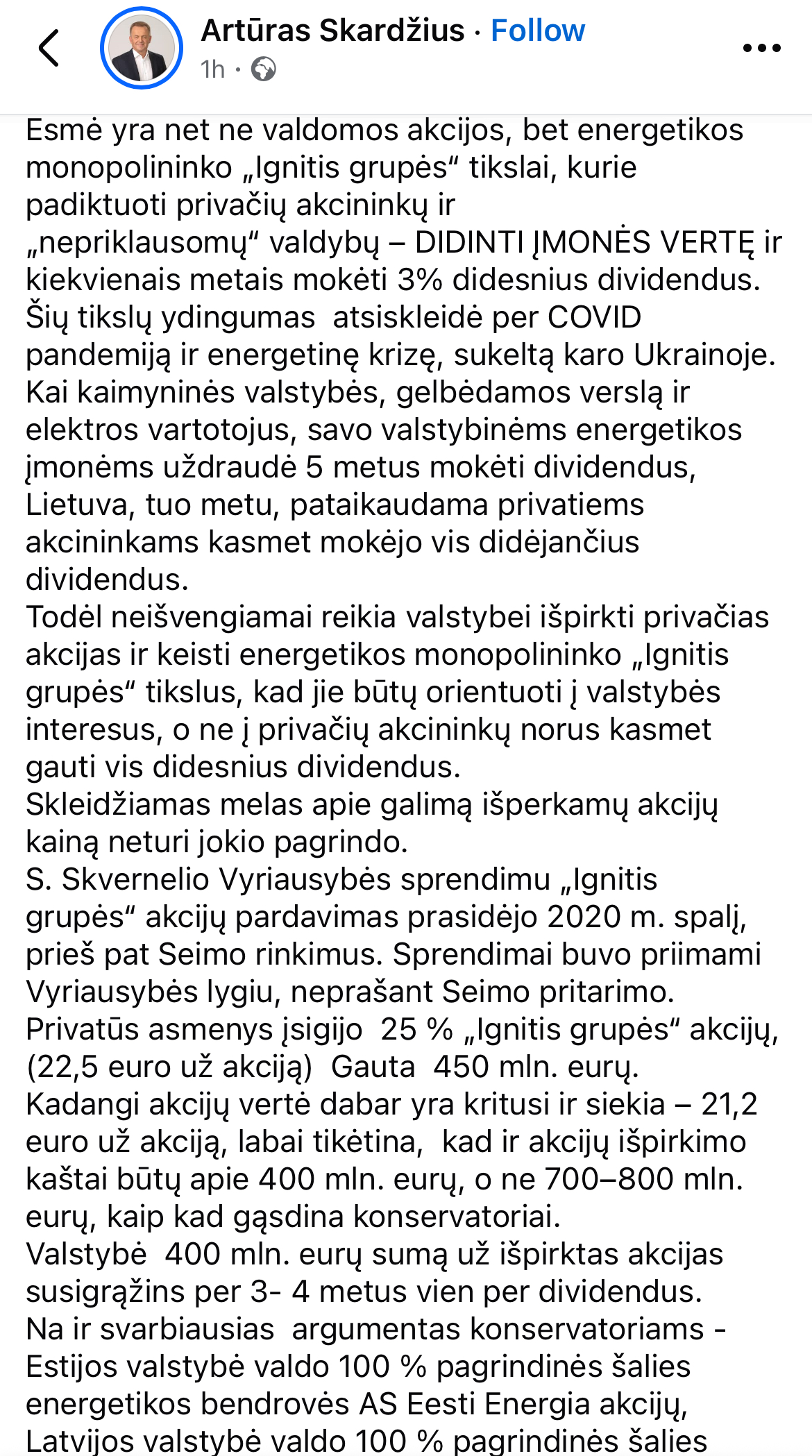 Q: Ką gautų Lietuva ir jos gyventojai išperkant Ignitis mažumos akcininkus? A: Lietuva ir jos piliečiai iš to jokios naudos negautų – kadangi valstybei jau dabar priklauso kontrolinis akcijų paketas, ji dabar gali priimti visus svarbiausius strateginius sprendimus. Q: Ką prarastų valstybė ir jos gyventojai? A: Pradžiai reikėtų iki pusės milijardo eurų, kurių reikėtų mažumos akcijų išpirkimui. Iš kur tokie pinigai? Dar daugiau skolintis? Dar labiau didinti mokesčius? Ar skirti mažau pinigų krašto apsaugos finansavimui? Praradimai būtų ir platesnio masto – mažėtų likvidumas akcijų rinkoje, būtų mažiau potencialių stambių užsienio investuotojų, sunkiau kitoms valstybės ir privačioms įmonėms pritraukti kapitalo. Q: Kam gali būti naudinga tokia iniciatyva? A: Jei nelieka smulkiųjų akcininkų, galima įmonės akcijas delistinguoti iš biržos, nebus akylų investuotojų akių, stebinčių įmonės ketvirtines finansines ataskaitas, veiklos skaidrumą ir efektyvumą. Lengviau po kilimu keisti vadovus, stabdyti strategines investicijas į atsinaujinančią energetiką. Tai nenaudinga niekam, kam nors kiek rūpi ilgalaikė Lietuvos ir jos gyventojų gerovė. |