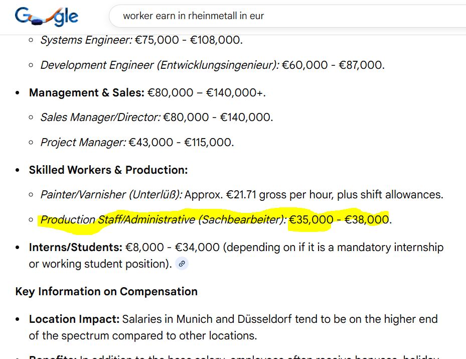 katuris [2026-02-07 00:31]: Jei nezinais kas kam ir kiek mokes kokio byb...rasineji,kad mokes 1k e ??? Todėl kad yra santykis tarp vadovų ir darbininkų algų. Pvz Vokietijoje Rheimetal vadovai gauna 80k -140k per metus. Darbininkai 35-38k. Čia prieš mokesčius. |