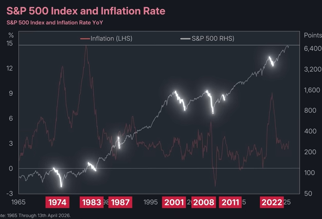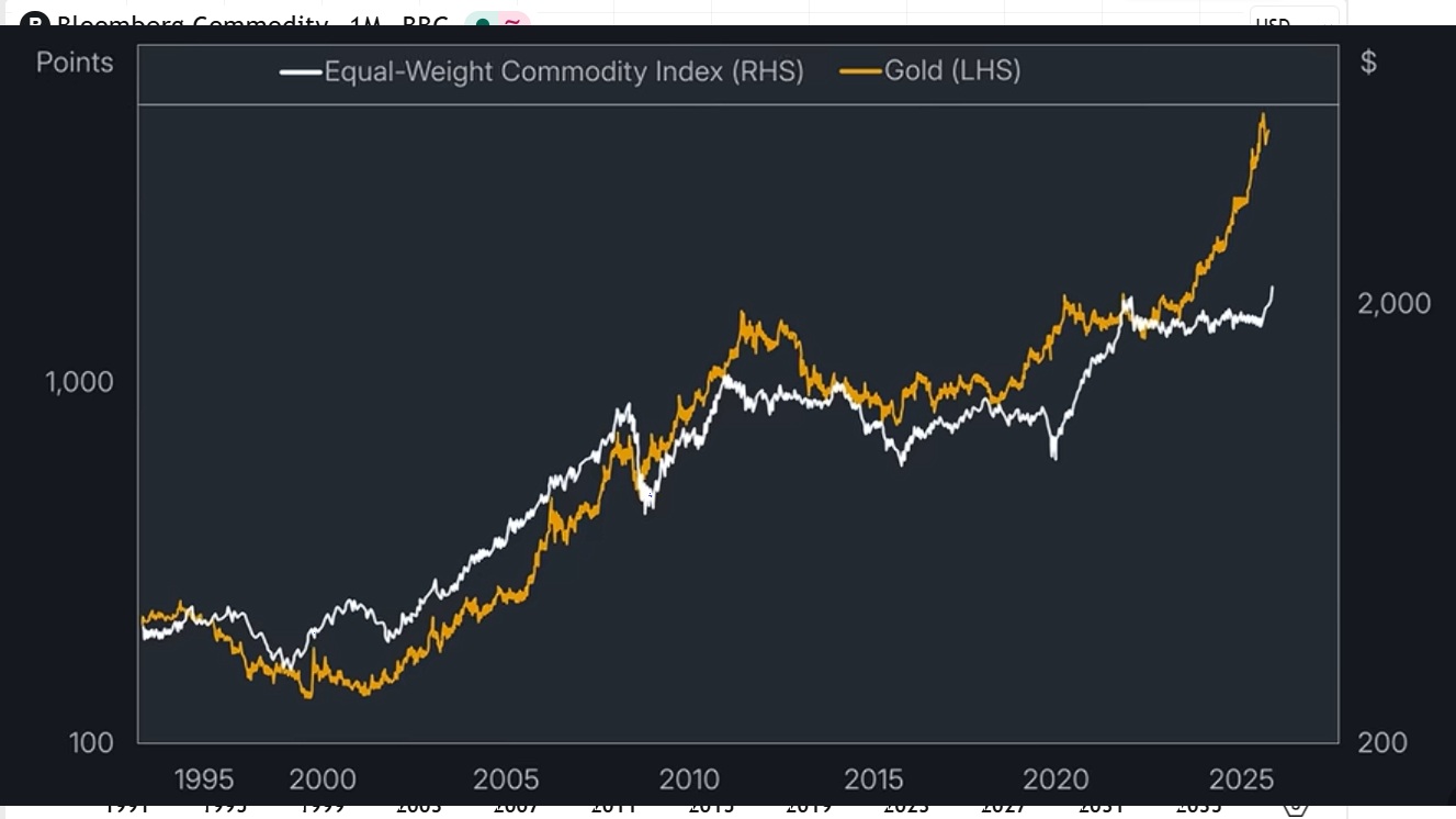rimtas [2026-04-21 11:07]: Zaliavos pradeda vytis aukso kaina. Sis grafikas gerai parodo kodel Aukso upside nera labai didele, kai tuo tarpu visko kito-dar tik pradzia dabartinis indekso spike'as labiausiai įtakotas Irano karo, bet šiaip galimai kainos vysis auksą, pritariu Growth stocks, high risk, options. No dividends, no Forex, no Baltics.