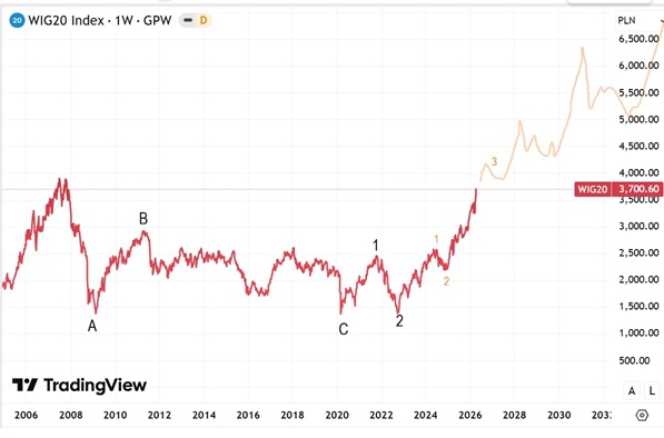 WIG20 indeksas lokalios korekcijos metu sėkmingai patestavo dabartinio augimo trendo liniją, po ko sekė nauja kilimo banga bei artėjame prie praeityje buvusio pasiekto visų laikų rekordinio lygio.
