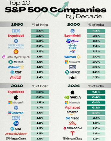 Iš dešimties pačių didžiausių plačiojo Amerikos akcijų rinkos indekso S&P500 įmonių 1990 metais nė viena neišliko TOP 10 iki šių dienų.