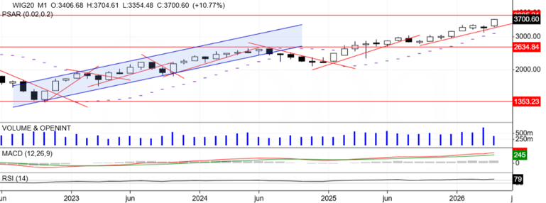 Po įspūdingo ralio praėjusiais metais, kaimyninėje Lenkijos akcijų rinkoje šiais metais ir toliau dominuoja buliai, o WIG20 indeksas išlieka virš augimo tendencijos linijos.