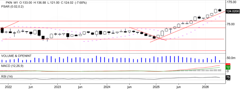 PKN Orlen akcijų kaina išlieka virš dabartinio augimo trendo, kuris prasidėjo dar 2025 metų pradžioje, linijos bei pasiekė naują absoliučiai rekordinį lygį.