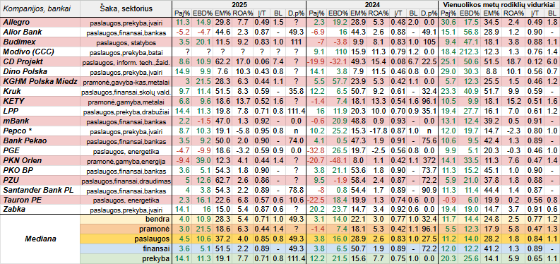 Pabrėžiame, kad tiek pajamų (lentelėje trumpinys Paj) pokyčiai, tiek EBITDA pelnų (lentelėje trumpinys EBD, kai kuriais atvejais naudojama pakoreguota EBITDA) pokyčiai yra apskaičiuoti remiantis Lenkijos kompanijų ir bankų pateiktomis oficialiomis finansinėmis ataskaitomis. Kaip įprasta pateikiame EBITDA maržas (lentelėje EM%), įsipareigojimų ir turto (lentelėje Į/T), bendrojo likvidumo (BL), turto grąžos (ROA%) rodiklius. Be to, pristatomi ir naujausi santykiniai finansiniai rinkos vertės rodikliai.