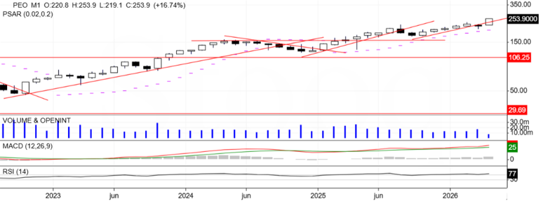 Bank Pekao akcijų kaina praėjusį mėnesį nukrito žemiau augimo trendo linijos, tačiau šį mėnesį vėl sugrįžo virš jos bei pasiekė naują absoliučiai rekordinį lygį. Jei paaiškės, jog tai tvarus judesys, sulauksime naujos augimo bangos.