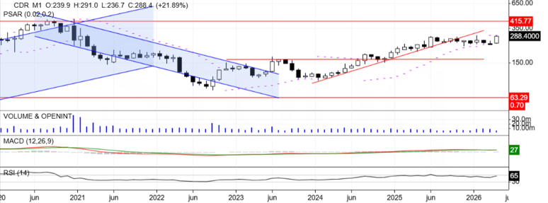 Nuo praėjusių metų vasaros vidurio CD Projekt akcijų kaina buvo horizontalioje - konsolidacinėje fazėje, na o šį mėnesį sulaukėme bandymo pradėti naują augimo etapą. Artimiausiais mėnesiais paaiškės, ar tai pavyks tvariai padaryti.