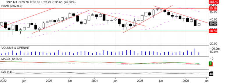 Dino Polska akcijų kaina išlieka žemiau kritimo trendo, kuris prasidėjo praėjusią vasarą, linijos. Šiuo metu testuojamas ankstesnio kritimo metu suformuotas dugnas. Jei šis lygis atlaikys, tuomet susiformuotų dvigubas dugnas, kuris pranašautų atšokimą.