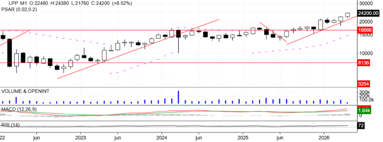 LPP akcijų kaina yra virš augimo trendo linijos ir šiuo metu nuosekliai šturmuoja vis naujesnius absoliučiai rekordinius lygius.