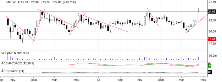 Zabka akcijų kaina šiuo metu testuoja savo visų laikų rekordinį lygį. Jei pavyks tvariai virš jo pakilti, tuomet augimas prasitęs, tad būtina atidžiai stebėti padėtį.